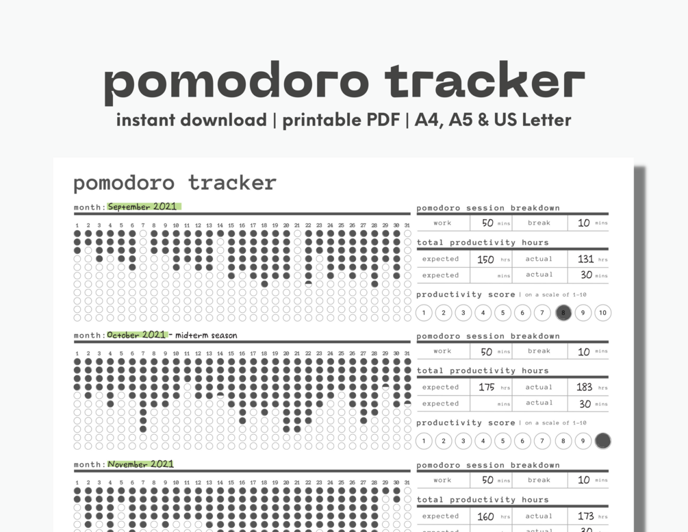 POMODORO TRACKER ~ PRINTABLES & DIGITAL DOWNLOADS IN A4, A5 & US LETTER by Project Studiously